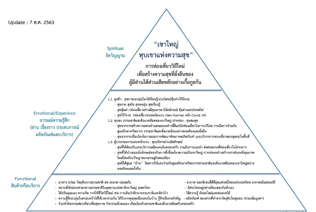 แนวคิดโครงการท่องเที่ยววิถีใหม่ เขาใหญ่หุบเขาแห่งความสุข แนวคิดหลักโครงการ “เขาใหญ่หุบเขาแห่งความสุข” มุ่งพัฒนาการท่องเที่ยววิถีใหม่ เพื่อสร้างความสุขที่ยั่งยืนของผู้มีส่วนได้ส่วนเสียหลัก ได้แก่ ลูกค้า ผู้ประกอบการ ชุมชน ธรรมชาติและสิ่งแวดล้อมในพื้นที่เขาใหญ่-ปากช่อง วัตถุประสงค์โครงการ เพื่อส่งเสริมการท่องเที่ยววิถีใหม่ในพื้นที่เขาใหญ่-ปากช่องอย่างยั่งยืน โดยยึดหลักปรัชญาของเศรษฐกิจพอเพียง เพื่อสร้างจิตสำนึกและความตระหนักในการดูแลธรรมชาติและสิ่งแวดล้อมในพื้นที่เขาใหญ่-ปากช่องแบบมีส่วนร่วม เพื่อสร้างเครือข่ายและส่งเสริมศักยภาพการพัฒนาการท่องเที่ยววิถีใหม่ของสถานประกอบการที่เข้าร่วมโครงการ การสร้างจิตวิญญาณแห่งพื้นที่ Sense of Place / Sanctuary for the Sense ของโครงการเขาใหญ่หุบเขาแห่งความสุข